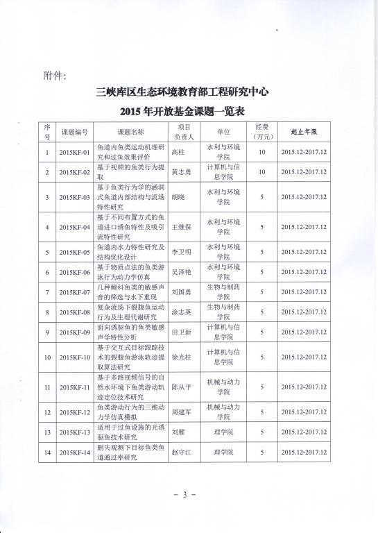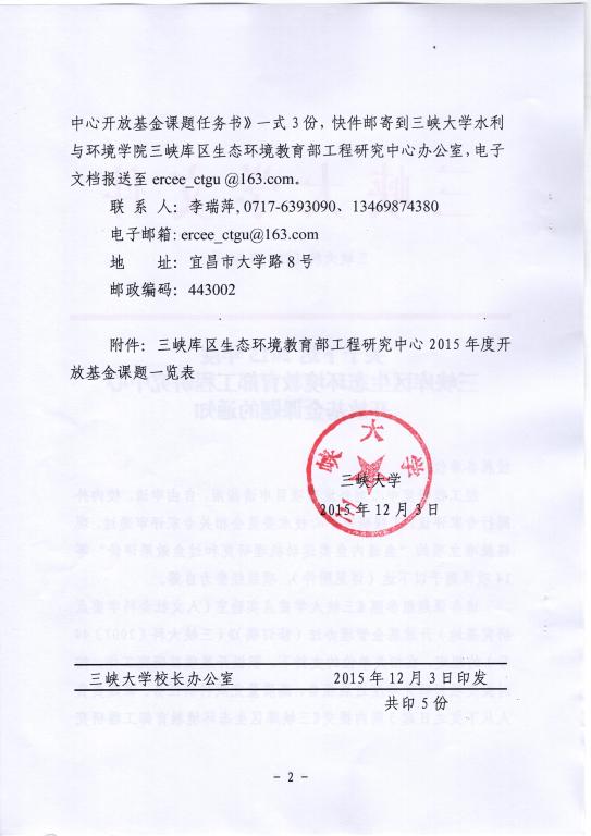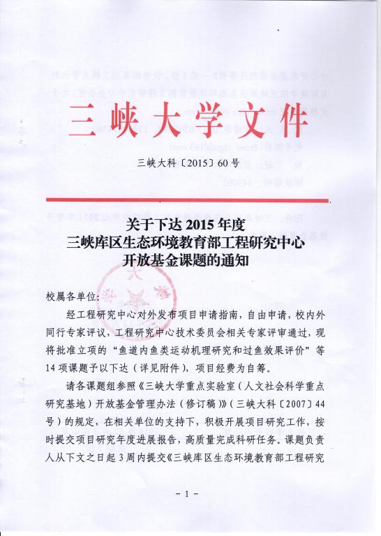 关于下达2015年度三峡库区生态环境教育部工程研究中心开放基金课题的通知