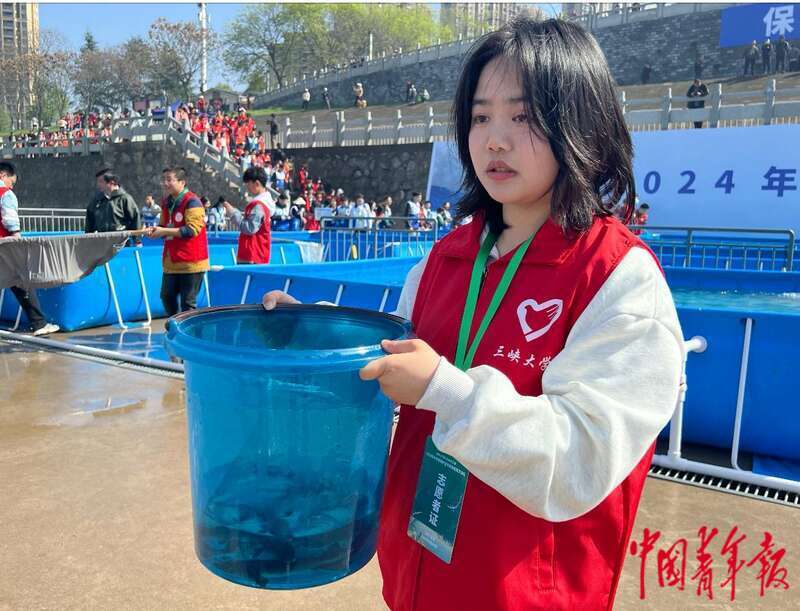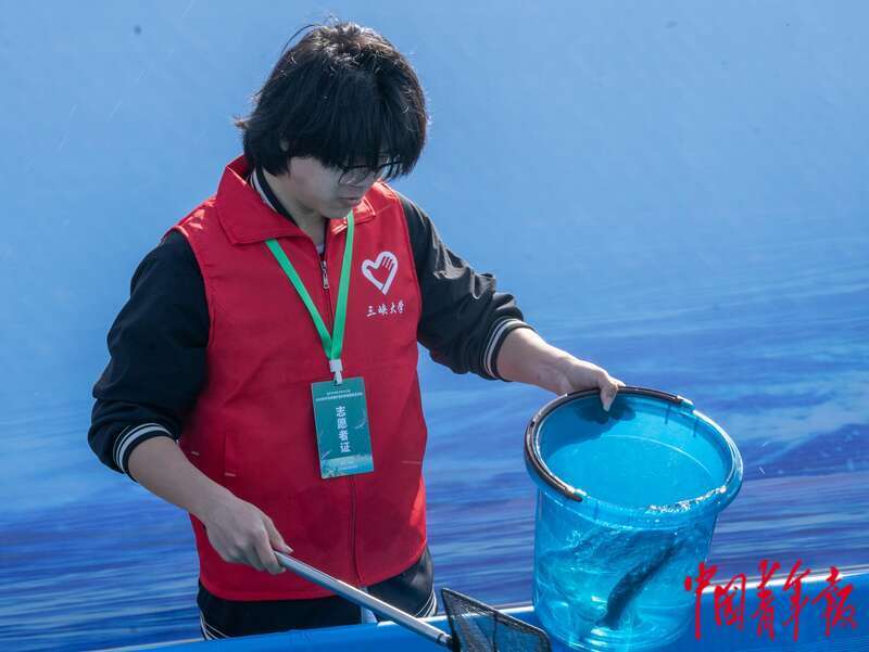 三峡大学学生参与中华鲟增殖放流活动已有10余年历史,该活动已经成为三峡大学学生的一门特色“必修课”。“报名全靠手速,报名链接发出基本都是‘秒杀’”,三峡大学益心“鲟”豚志愿服务队队员杨吉说。在活动现场,志愿者们提前从运鱼车将一条条中华鲟转运至暂养池,在放流当日,通过放流装置,帮助中华鲟回归长江。每一趟搬运,小鱼单人提,大鱼几人抬,往返上下数十阶台阶。虽然过程很辛苦,但是能够亲眼看到这些珍贵的中华鲟,感受到它们生命的活力,益心“鲟”豚的志愿者们觉得这真是一件非常震撼且自豪的事情!接近正午时分,气温不断攀升。志愿者们挥洒着汗水,毫不懈怠,为了让中华鲟在最适宜的温度内回归长江,大家加快了运输速度。在江边暂养池旁边,益心“鲟”豚志愿者们辛勤地传递着运输桶,分工协作,配合得当,运转高效。在放流装置处,大家轮流合力开闸放水,随着放流水槽闸门的打开,一尾尾中华鲟顺着滑道争相而下,跃入长江之中。