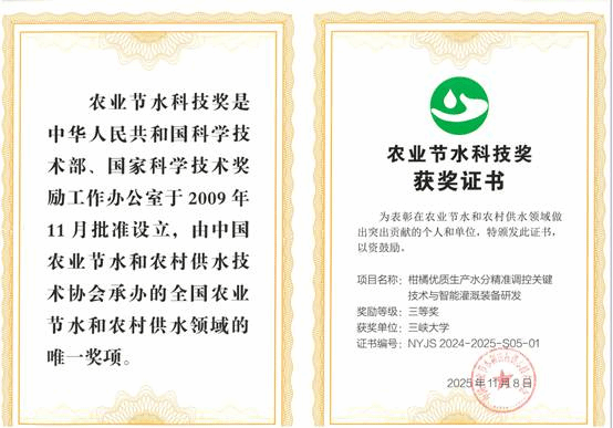 近日,第六届农业节水和农村供水技术发展论坛暨2024–2025年度(第十届)农业节水科技奖颁奖大会在广州召开。由我中心朱士江副教授团队牵头,联合宜昌市水利项目管理中心、上海华维可控农业科技集团股份有限公司等多家单位共同完成的《柑橘优质生产水分精准调控关键技术与智能灌溉装备研发》项目,凭借突出的技术创新与应用成效,荣获农业节水科技奖三等奖。农业节水科技奖经国家科学技术部、国家科学技术奖励工作办公室批准设立,是农业节水领域唯一权威奖项,旨在表彰推动农业节水与农村供水科技创新的先进成果与典型代表。
