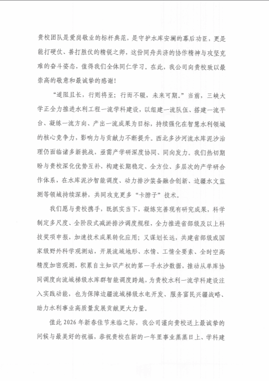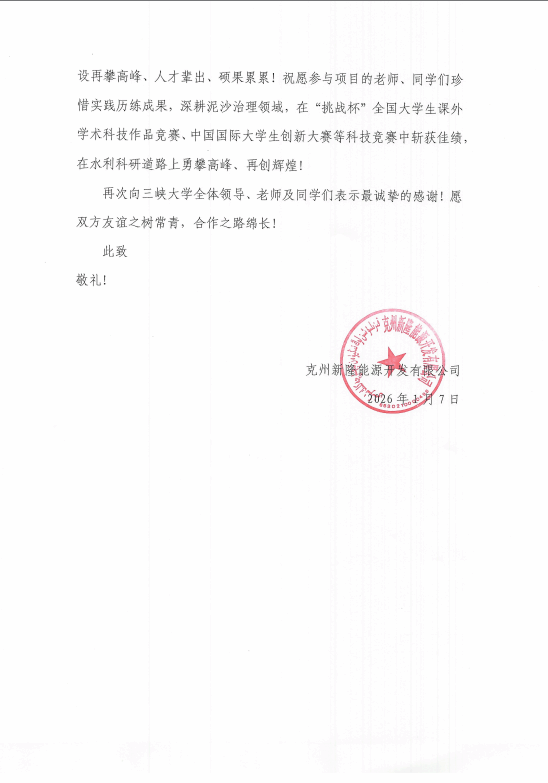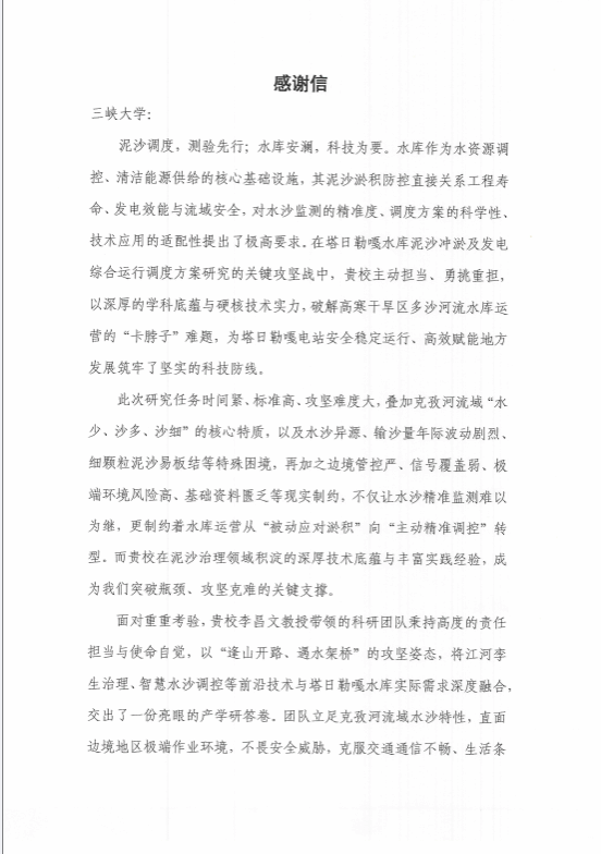 近日,我中心收到克州新隆能源有限公司发来的感谢信,信中对我中心科研团队在塔日勒嘎水库泥沙治理项目中展现的硬核技术实力与责任担当致以高度赞誉。