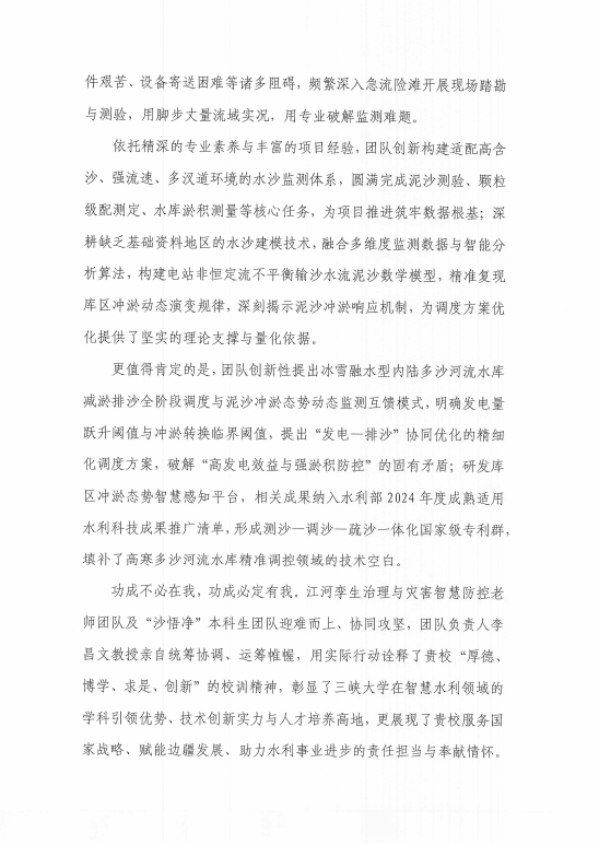 我中心李昌文老师带领其团队“江河孪生治理与灾害智慧防控”,直面新疆“水少沙多、沙细质轻”的天然禀赋,以及信号覆盖薄弱、极端环境频发、基础资料匮乏等多重现实困境,毅然扛起推动水库运营从“被动清淤”向“主动精准调控”转型的重任。团队秉持“逢山开路、遇水架桥”的攻坚锐气与“敢为天下先”的创新精神,踏遍急流险滩开展精准测验与水沙模拟,将智慧水沙调控前沿技术与工程实际深度耦合,以实打实的科研行动破解边疆水利难题。