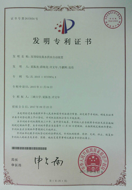 发明专利:屋顶绿化集水供水自动装置
